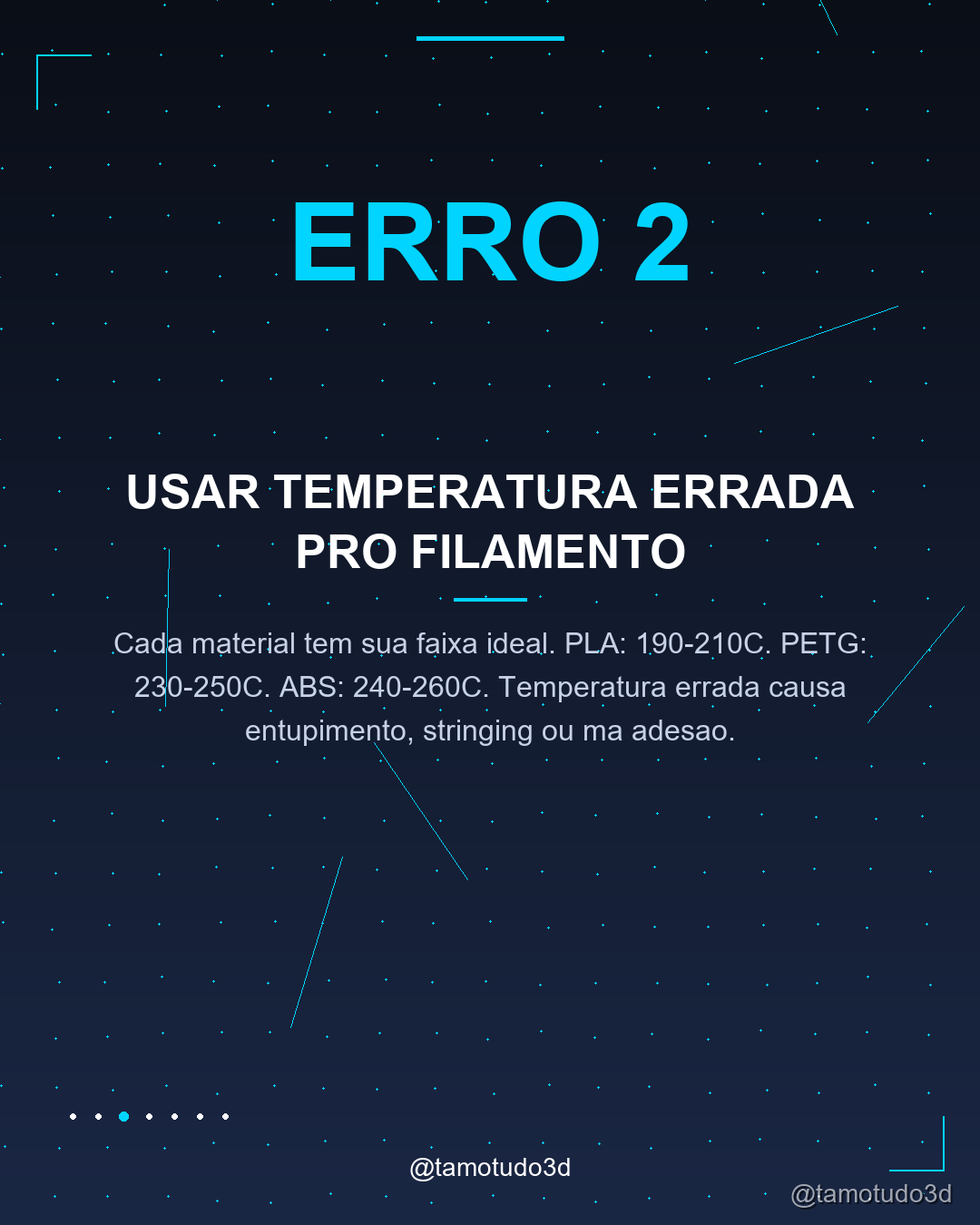 Cada tipo de filamento tem uma faixa de temperatura ideal. Usar a temperatura errada e como cozinhar em fogo errado — o resultado nunca vai ficar bom.