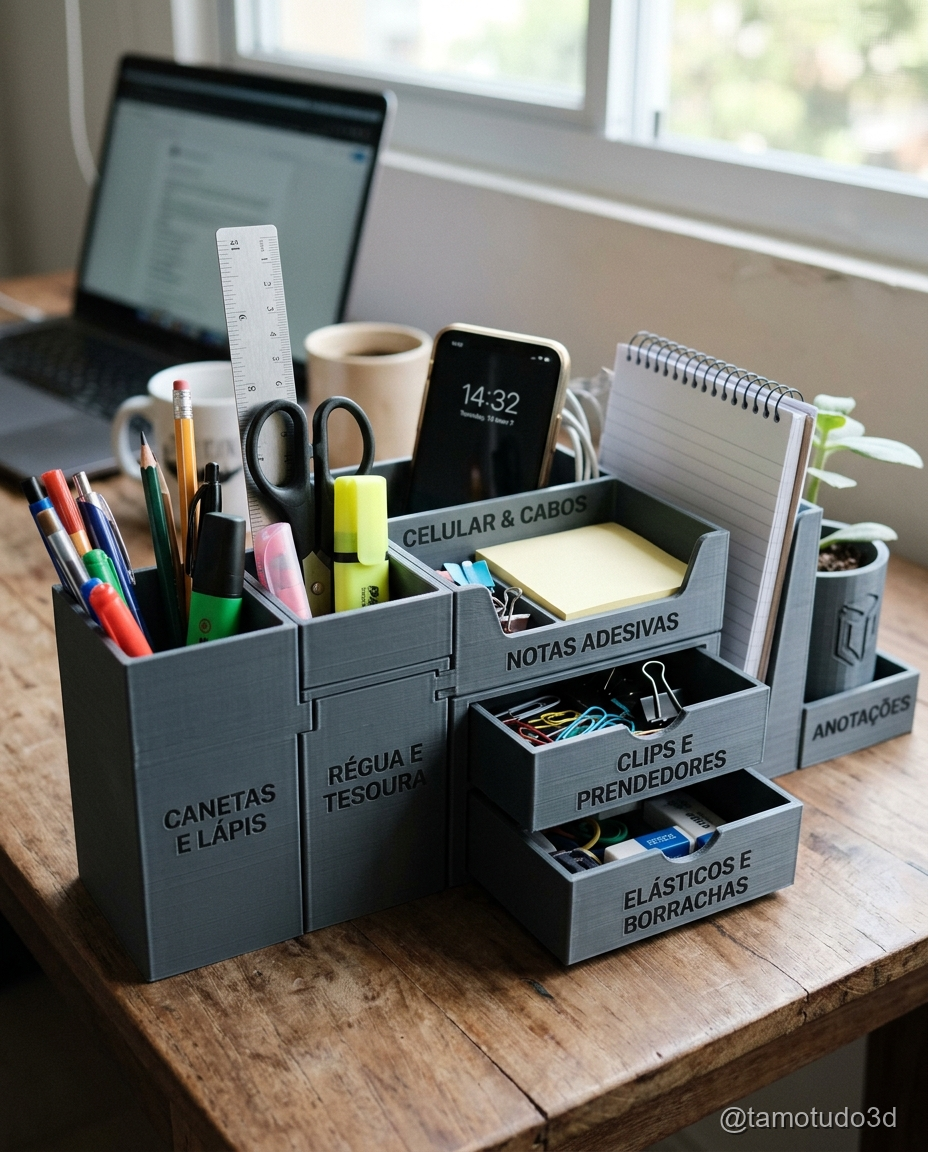 Organize o espaço de trabalho de seus clientes com organizadores de mesa impressos em 3D. Eles oferecem uma excelente oportunidade para personalização e design modular, o que pode ser um grande atrativo para quem busca algo único. Além disso, o custo de produção é baixo, e a venda desses itens pode gerar uma boa margem.