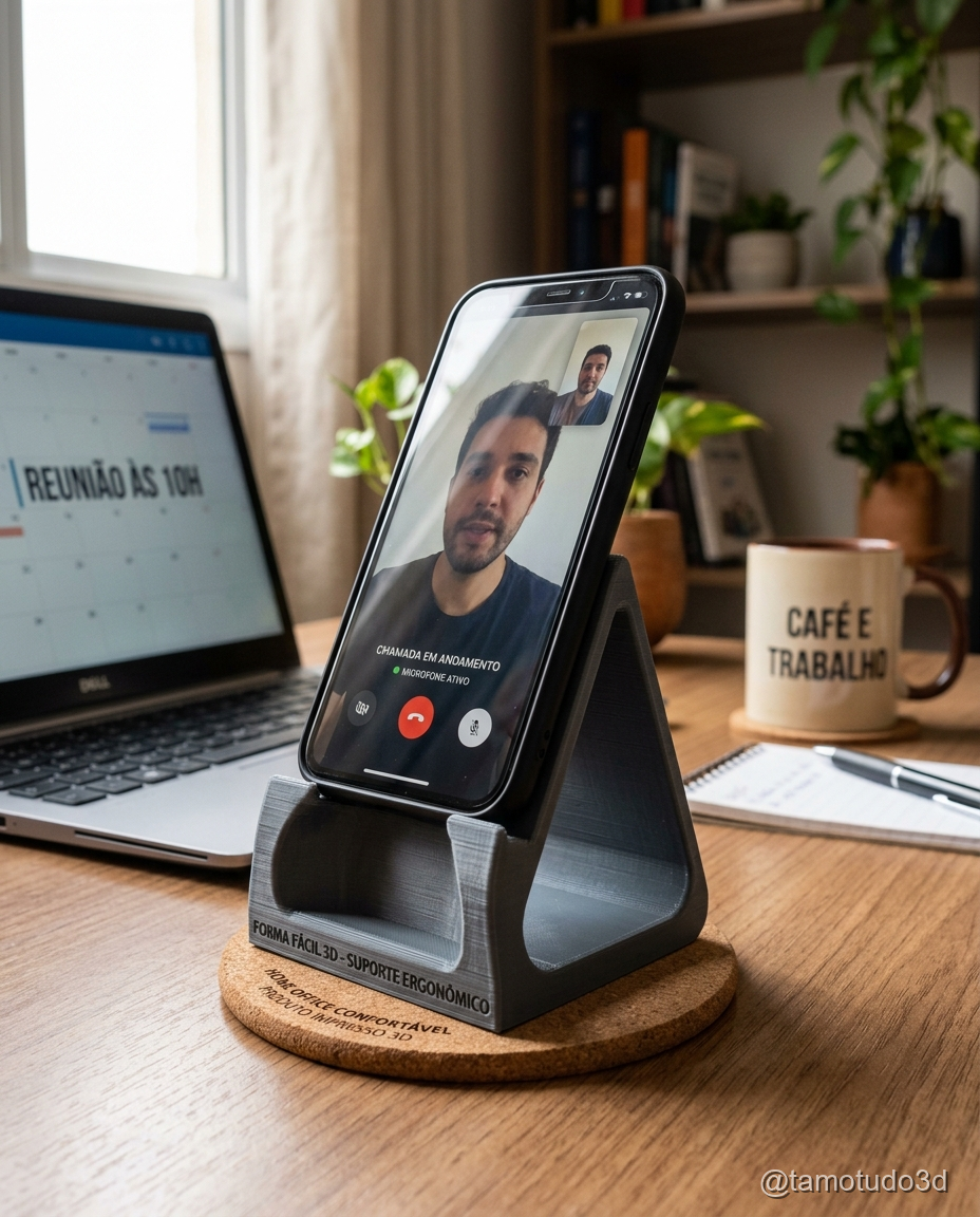 O suporte de mesa ajustável é perfeito para quem passa muito tempo em home office ou realiza videochamadas. Este modelo permite ajustar o ângulo do celular para uma visualização confortável durante longas sessões de chamadas ou vídeos.