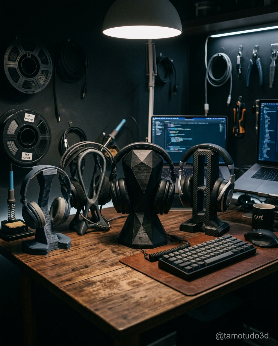 Se você já se pegou lidando com fios embaraçados ou fones de ouvido que ocupam muito espaço na mesa, sabe o quanto isso pode ser frustrante. Os suportes 3D para headphones são uma excelente maneira de resolver esse problema. Além de manterem seus fones organizados e acessíveis, eles também ajudam a reduzir a bagunça de cabos, criando uma mesa mais limpa e funcional. Como os modelos são impressos em PLA, o custo é bem baixo (cerca de R$2-6 por peça), e o tempo de impressão varia de 1 a 3 horas.