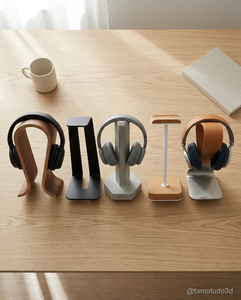 Existem diferentes tipos de suportes de headphone 3D, e a escolha do modelo certo depende do seu estilo e das suas necessidades de organização. Vamos ver algumas opções: