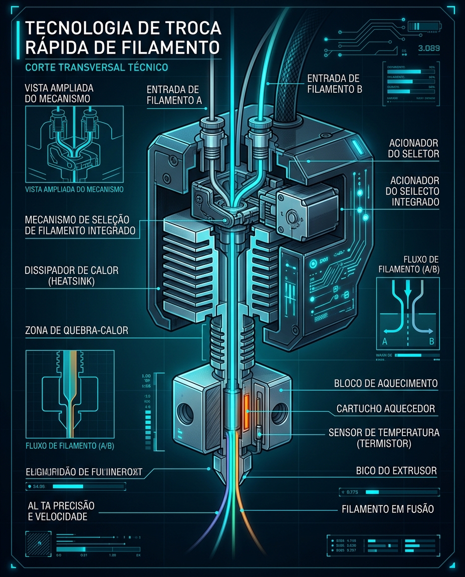 O grande destaque é o sistema ACE Gen 2, integrado diretamente ao cabeçote de impressão — algo incomum na categoria. Essa decisão de engenharia muda drasticamente o tempo de troca de cores e o desperdício de material, dois dos maiores problemas da impressão multicolor tradicional.
