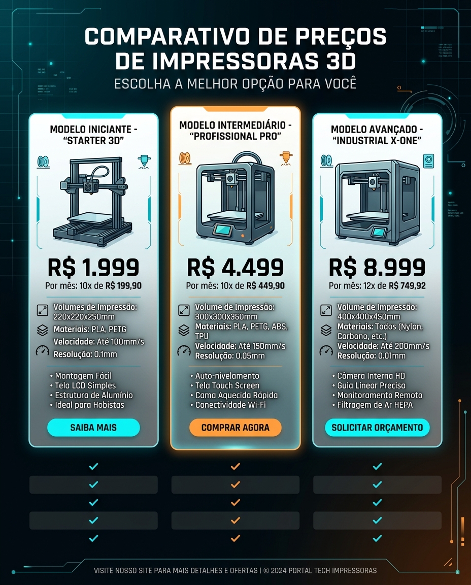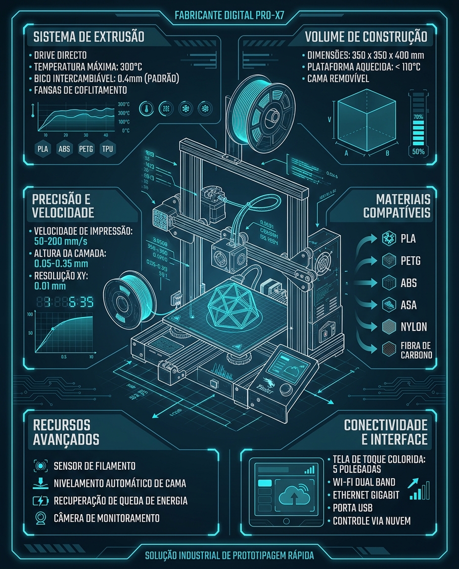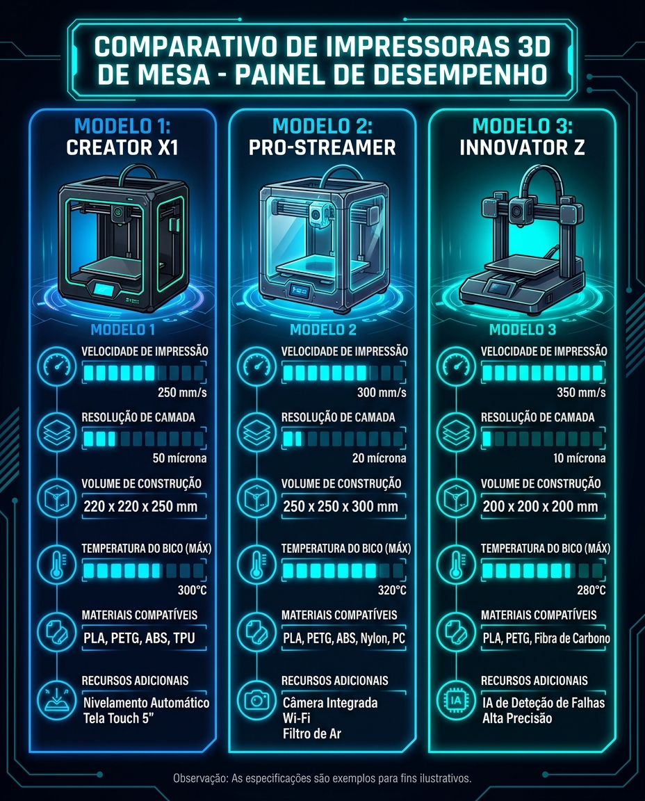 O consumo energético típico varia entre 120 W e 300 W durante impressão, podendo atingir picos próximos de 400 W no aquecimento inicial. Isso representa custo operacional estimado entre R$0,10 e R$0,30 por hora, dependendo da tarifa elétrica.