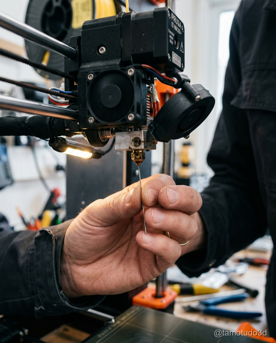 Se o cold pull não resolver o problema, você pode usar uma agulha de 0,4mm para desobstruir o bico manualmente. Esse método é ideal para entupimentos leves, onde o filamento não está completamente bloqueando a passagem de extrusão.