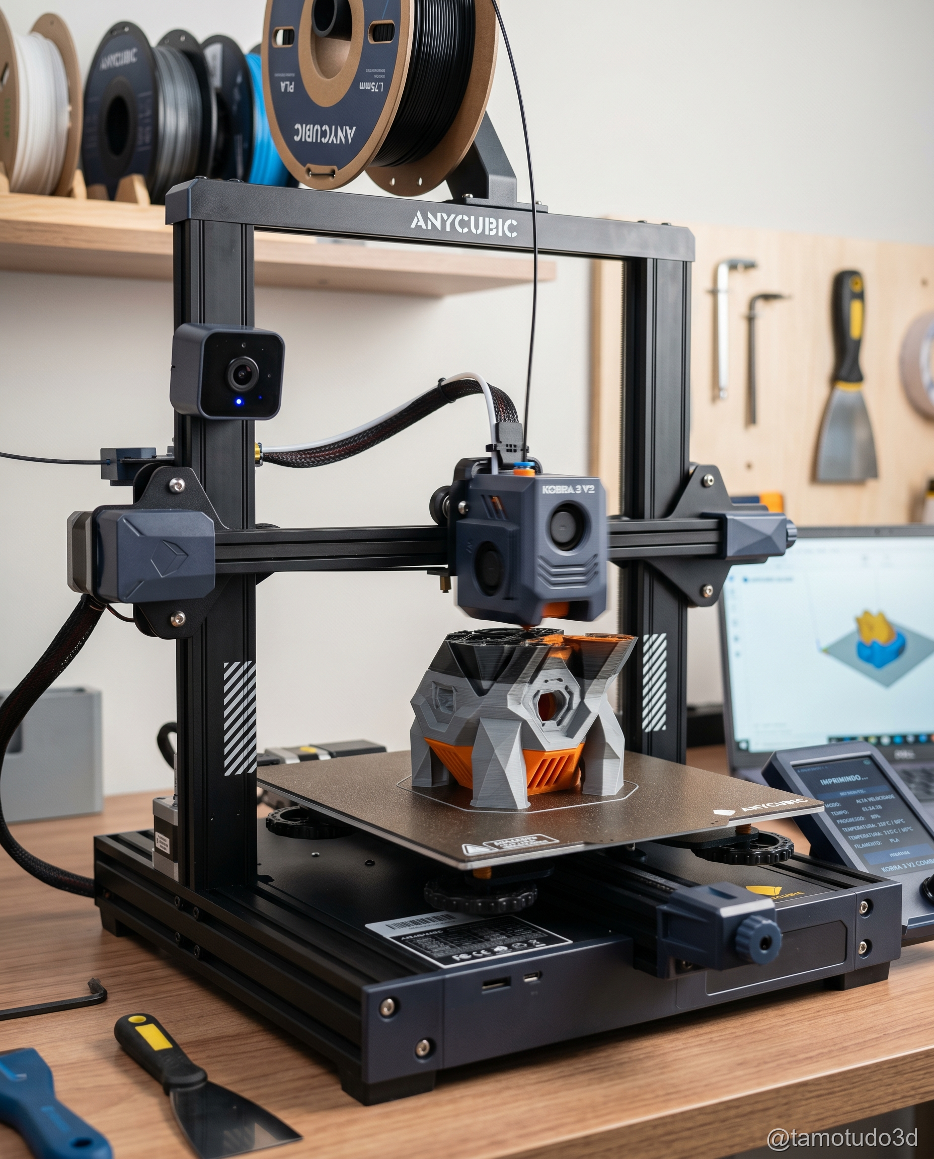 A Kobra 3 V2 Combo se destaca por velocidade e praticidade. Com até 600 mm/s, ela é ideal para quem precisa imprimir rapidamente ou monitorar o processo remotamente via câmera.