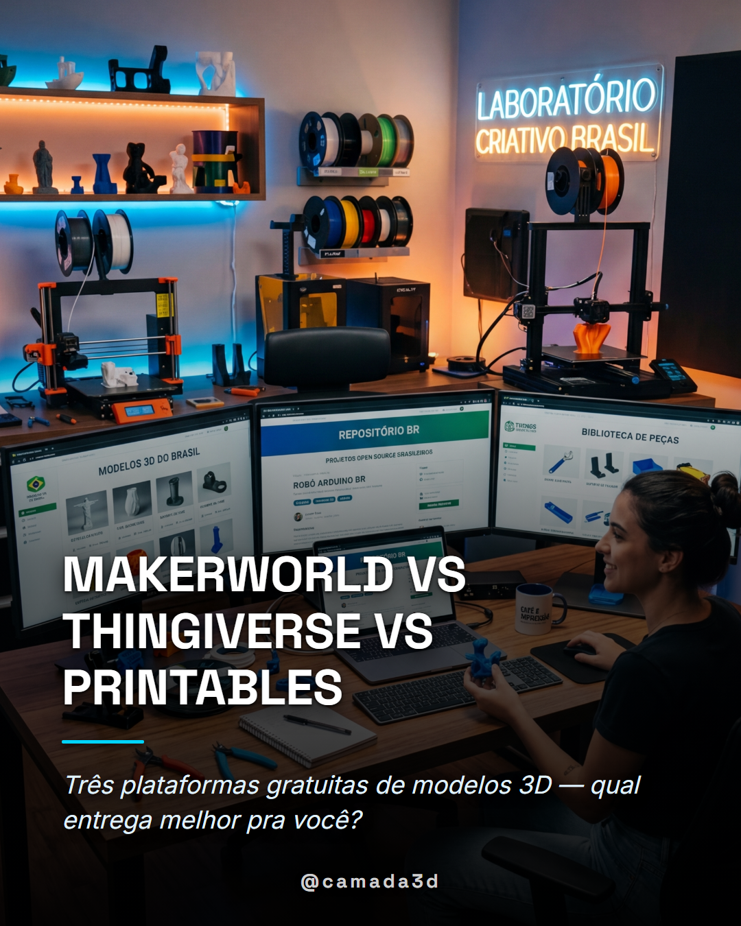 Hoje existem três grandes plataformas gratuitas nesse mercado: MakerWorld, Thingiverse e Printables. Todas são gratuitas e acessíveis no Brasil — mas cada uma entrega uma experiência bem diferente.