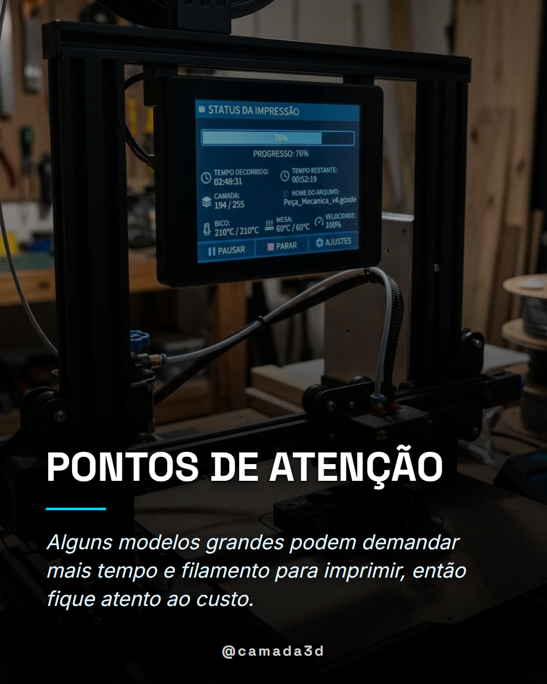 - Tempo de impressão: Modelos grandes podem levar várias horas ou até dias para imprimir, dependendo do tamanho e da resolução. Esteja preparado para aguardar bastante tempo, principalmente se for usar uma impressora com velocidade mais baixa.