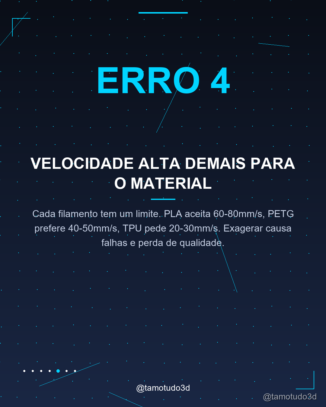 Cada filamento tem um limite prático de velocidade. Ultrapassar esse limite causa problemas mecânicos e de qualidade: