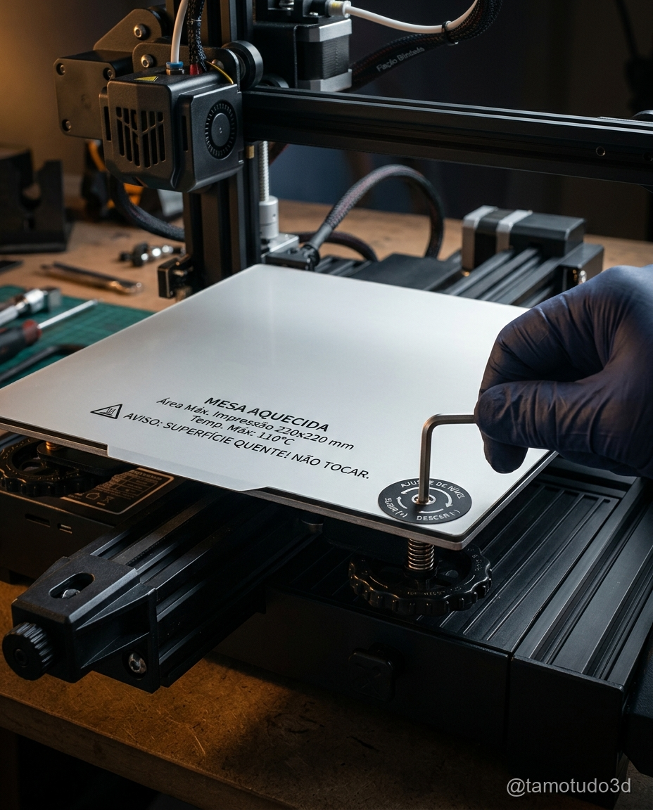 Como fazer: use uma folha de papel entre o bico e a mesa e ajuste os parafusos até sentir leve resistência ao mover o papel. Repita nos quatro cantos e no centro da mesa.