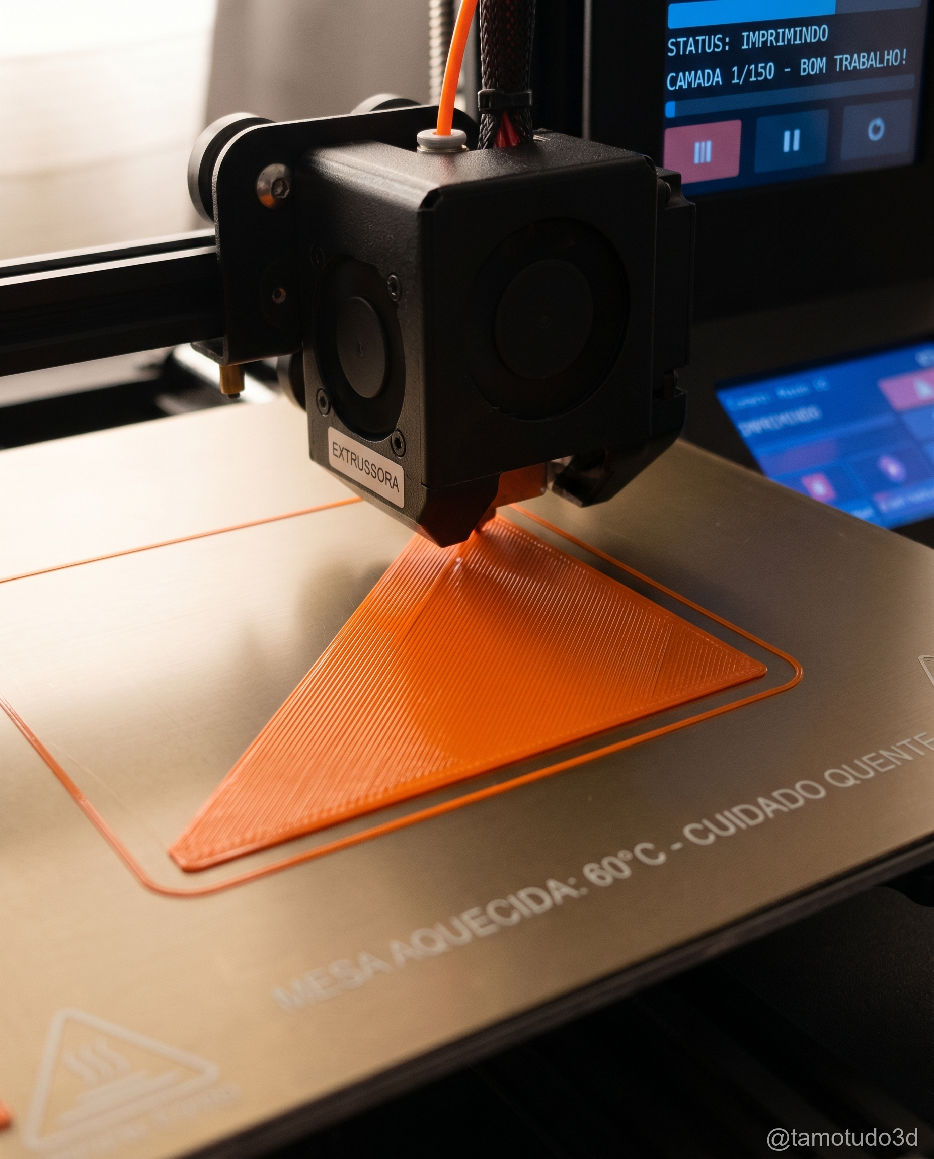 A primeira camada é crucial. Se não aderir bem, as chances de falha aumentam bastante. Ajuste a altura do bico e a temperatura adequada para o filamento: PLA normalmente entre 200–210°C e mesa a 60°C, PETG 230°C e mesa 70–80°C.