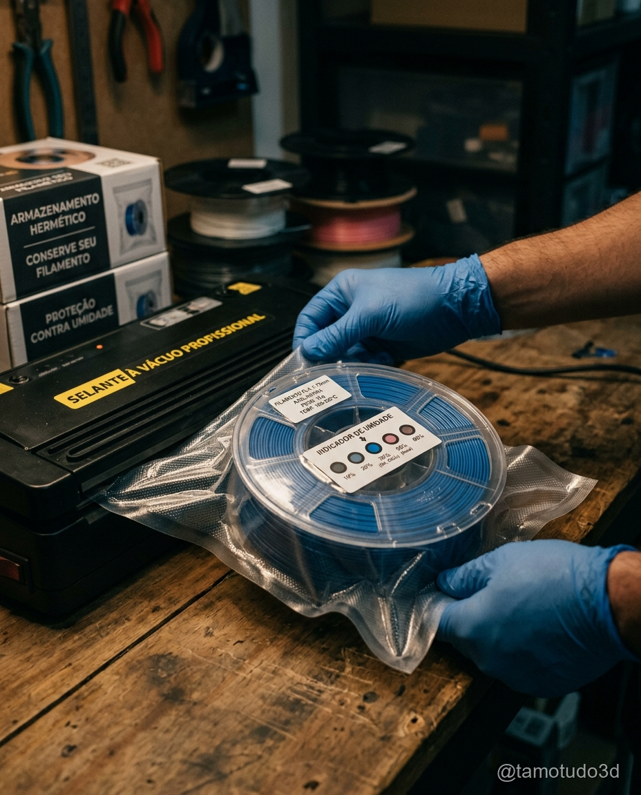 Filamentos PLA e PETG absorvem água rapidamente, causando bolhas e extrusão irregular. Armazene-os em sacos selados com sílica gel ou em caixas herméticas. Para filamentos especiais como TPU, a umidade pode ser ainda mais prejudicial.