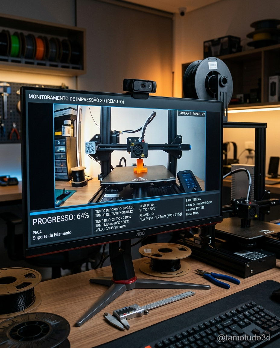 Câmeras ou software como OctoPrint permitem monitorar a impressão de qualquer lugar. Isso ajuda a identificar problemas rapidamente, interrompendo a impressão antes que o desperdício de material ou danos maiores aconteçam. É particularmente útil para impressões overnight.