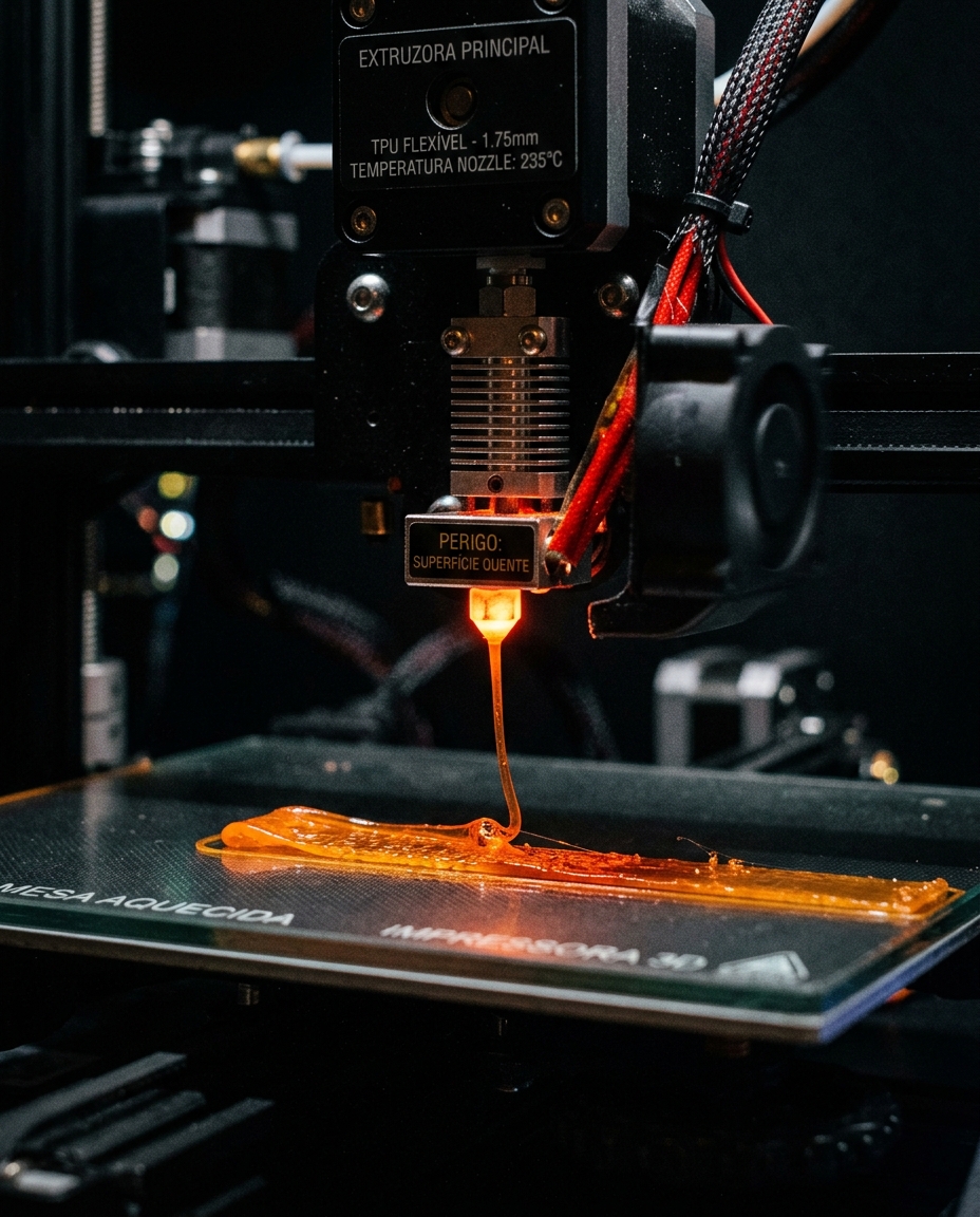 O filamento escolhido foi o TPU 95A, conhecido pela sua flexibilidade e resistência ao impacto.